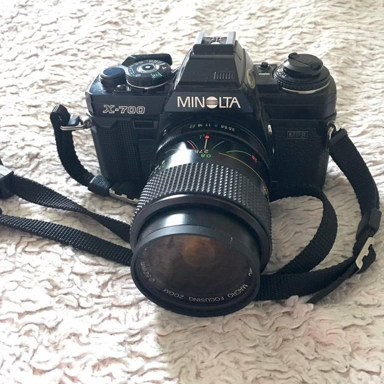 Minolta x-700 SLR 35mm film camera., Vivitar MC Macro 28-70mm Focusing Zoom, lens, Requires: 35mm film, 2 x LR44 batteries, (should be done already inside), Comes with a carrier, timer, tripod, flash and cleaning attributes and a user’s manual., Perfect condition, as new., Can throw in a roll of film if you need, Checked and repaired recently in 2020, in full working order.
